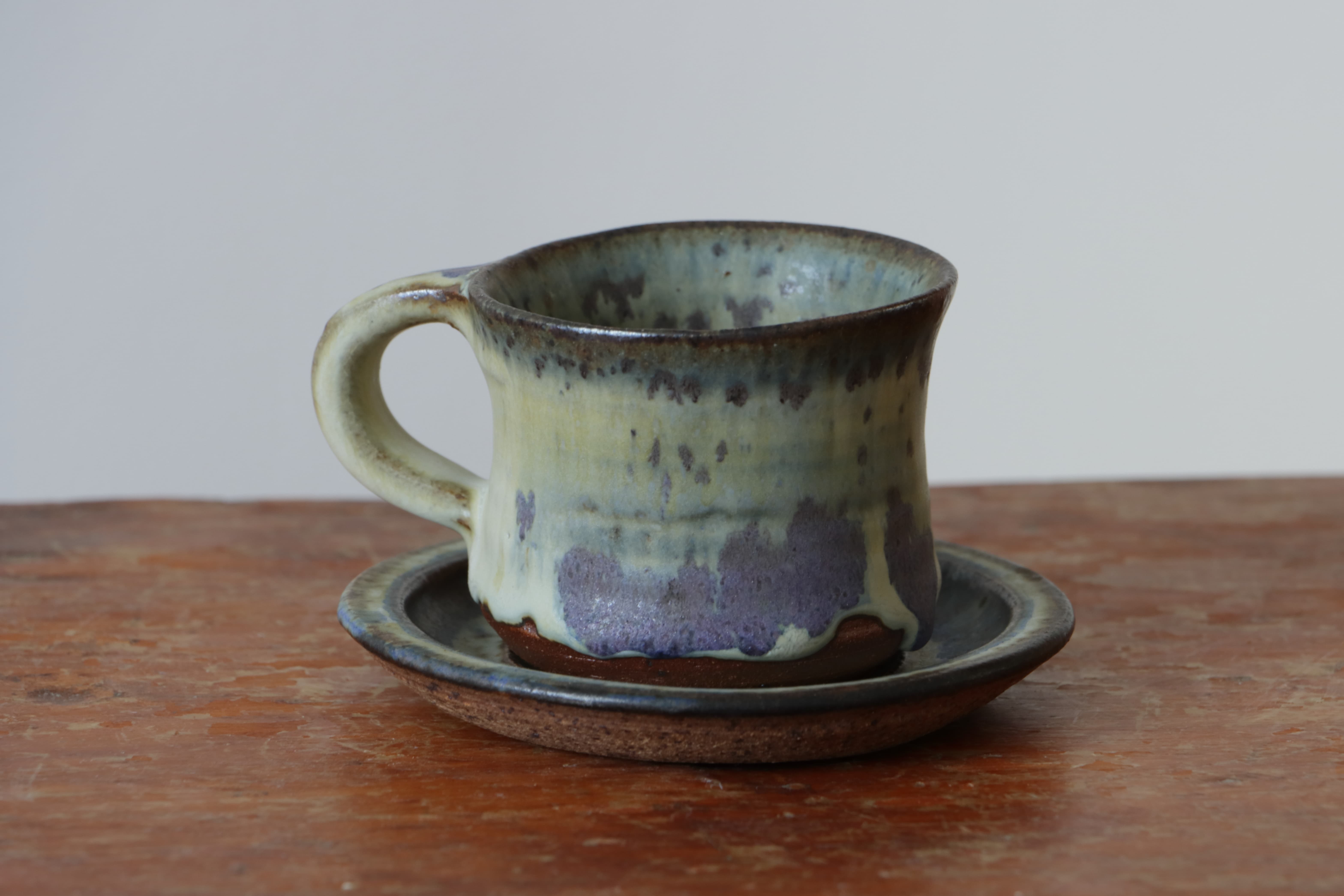 Vertical coffee cup with indented contours and stamped floral motif, sourced by Jeremy Laing, collection of Benny Nemer, Paris.